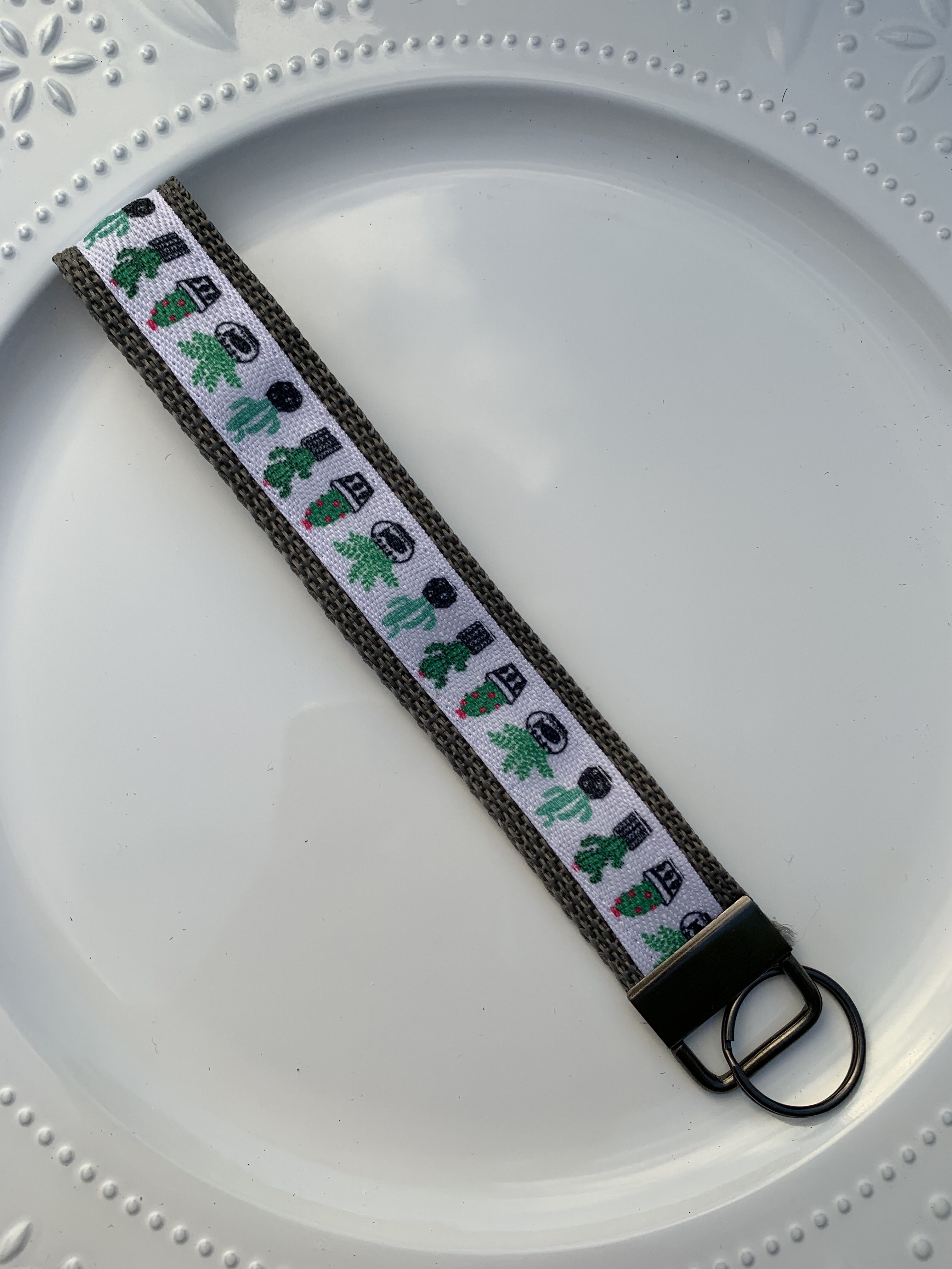This is a handmade blue border with cactus pattern with a dark grey clasp ring. Approximately 7 inches in length.