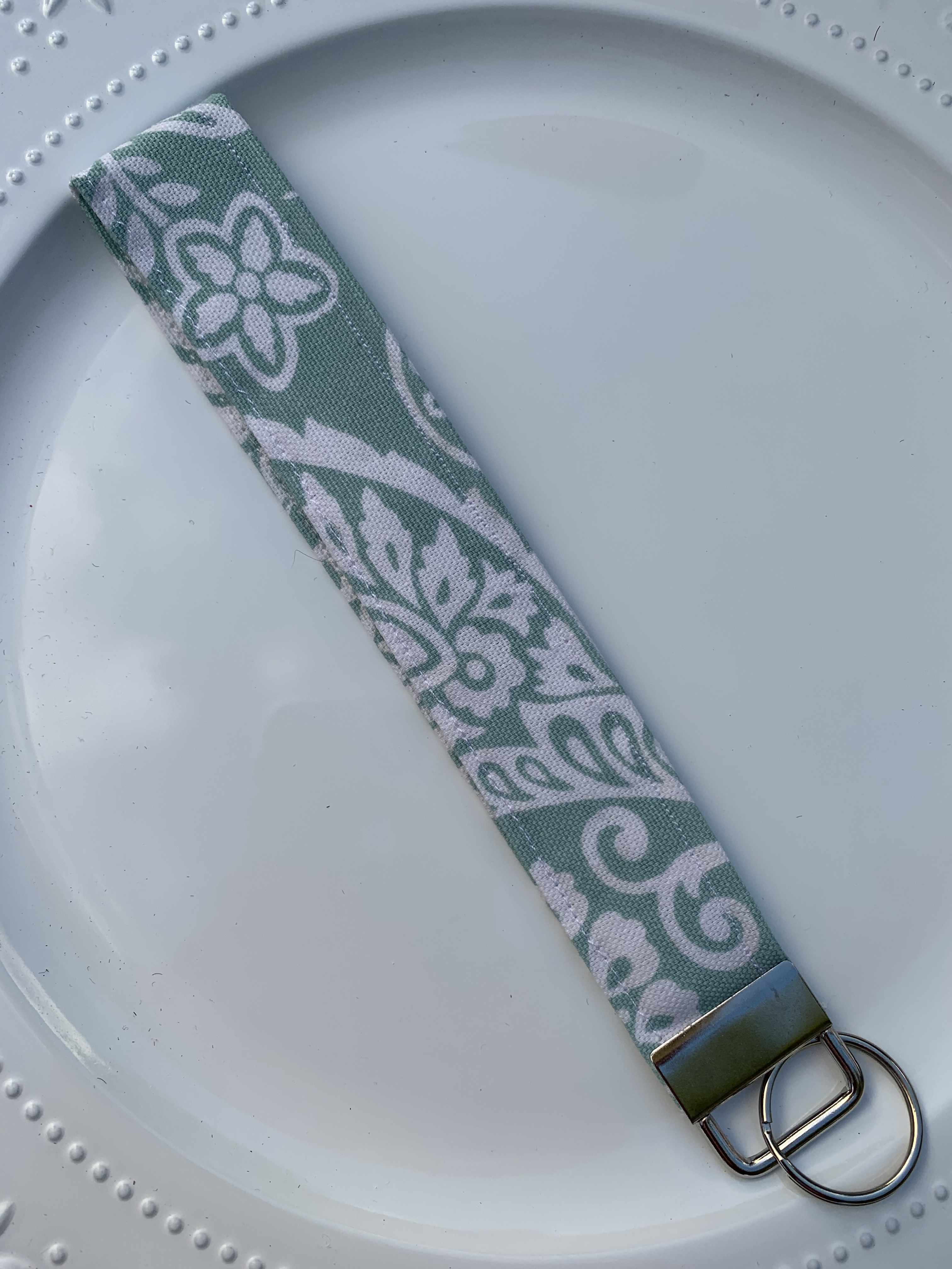 This is a handmade green floral pattern key fob with a silver color clasp and ring. Approximately 7 inches in length.